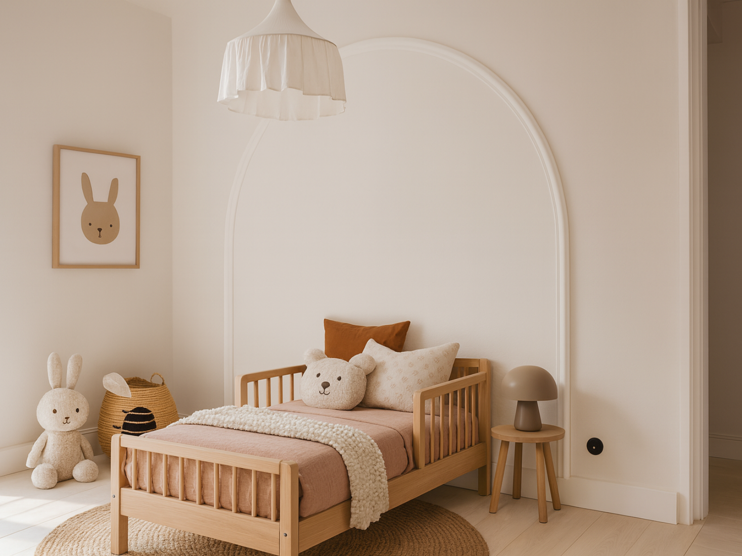 In deze sfeervolle kinderkamer vormt de grote boog op de muur een subtiel en speels accent. De zachte ronding creëert een gevoel van geborgenheid en brengt harmonie in de ruimte. Deze elegante boog is gemaakt met de flexibele wandlijst P8020, die zich perfect laat buigen tot een vloeiende boog van minimaal 200 cm breed. Ook de flexibele wandlijst P8030 en flexibele wandlijst PX175 zijn ideaal voor deze toepassing. De combinatie van lichte tinten, natuurlijke materialen en de verfijnde boog op de muur zorgt voor een rustgevende en stijlvolle uitstraling.