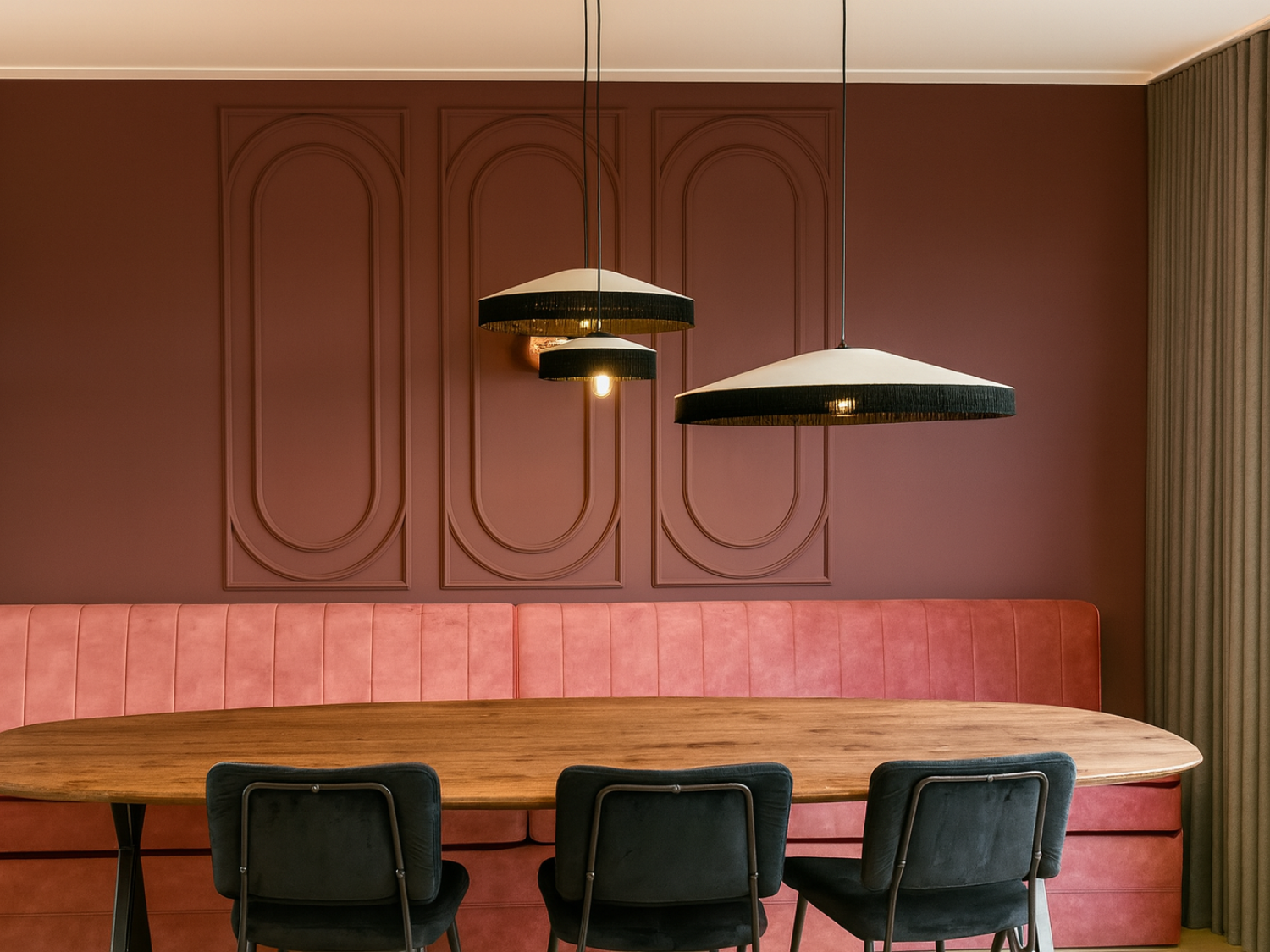 De wand in deze stijlvolle eetkamer is opgebouwd uit elegante, rechthoekige kaders waarin de ronde vormen subtiel zijn geïntegreerd. De strakke lijnen zijn gecreëerd met wandlijst PX103, terwijl de twee afgeronde vormen binnen elk kader zijn gemaakt met de flexibele wandlijst PX103F. Deze combinatie van geometrische precisie en vloeiende rondingen zorgt voor een verfijnd contrast dat de muur tot een echte eyecatcher maakt. De warme kleur van de wand versterkt het luxe karakter van het geheel, terwijl de vormen diepte en dynamiek toevoegen.
