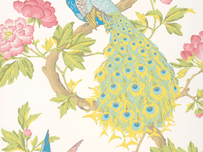 Dit luxe behangontwerp brengt de charme van 19e-eeuwse ontwerpen in jouw huis. Met een mix van pauwen, exotische bloemen en bladeren voegt het een elegante Oosterse flair toe aan je interieur. Perfect om een unieke sfeer en warme ambiance te creëren.
