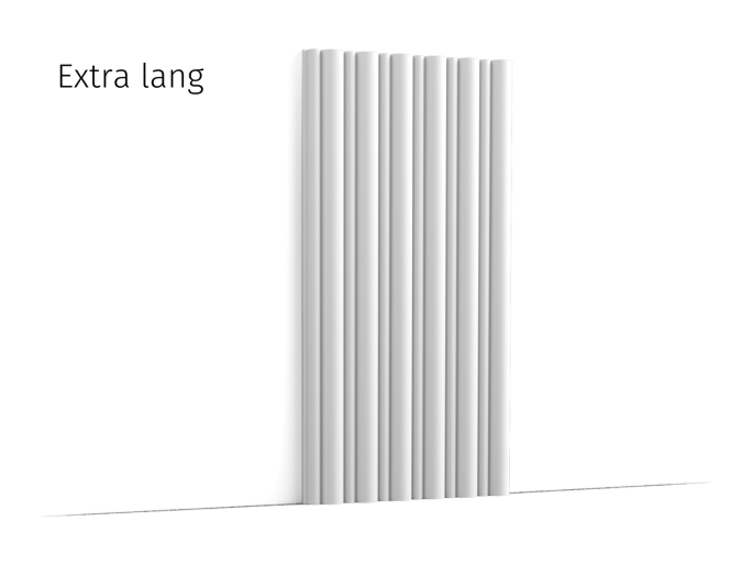 Het Orac Decor wandpaneel WX211-260 vertoont afwisselend brede en smalle bollingen van ca. 28 & 14 mm. De werkende afmeting van het paneel is 260 x 25 x 1,7 cm. Het wandpaneel WX211-260 is de langere uitvoering van de WX211 en is net als de kortere variant voorzien van een mes en groef verbinding. De totale breedte van het paneel is 25,5 cm inclusief mes.